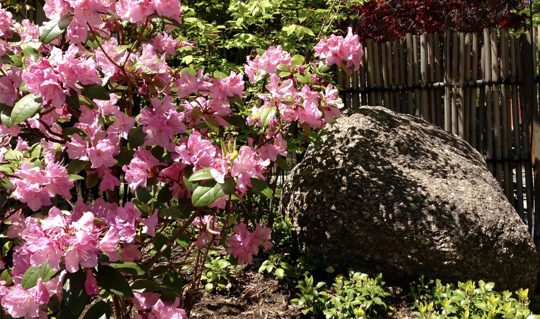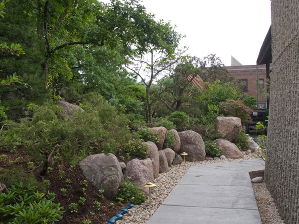 The physical creation of the garden began in late March 2014 and work was completed on June 1, 2014. The days between those dates were filled with, among other things, the temporary removal of several trees; a three-day search for boulders of the right shape, size and origins; and the planting, pruning and shaping of trees.