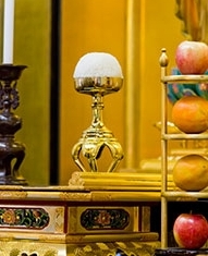 Two buppanki (Buddha food vessels) sit on either side of the gokuden and are used for food offerings. Rice is the traditional offering since rice has been a staple food in Japan and an original offering. When a buppanki contains rice, it also looks like a lotus flower.