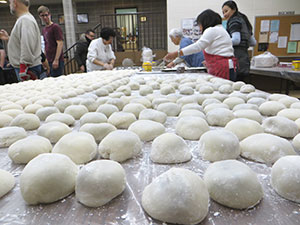 At MBT, we celebrate Mochitsuki as a social gathering, which is both fun and draws upon the strength of many rice pounders. We still take turns pounding the rice with the old-style kine in a piston-like pattern. But we also employ electric rice pounders to help produce 450 pounds of rice that, after pounding, gets shaped into small balls by dozens of participants—from first-timers to seasoned veterans, children 12* and older to not-so-young kids-at heart. (*Typically on the Sunday following Mochitsuki we have a special children’s mochitsuki starting at 10:30 am where children of all ages are welcome to participate).