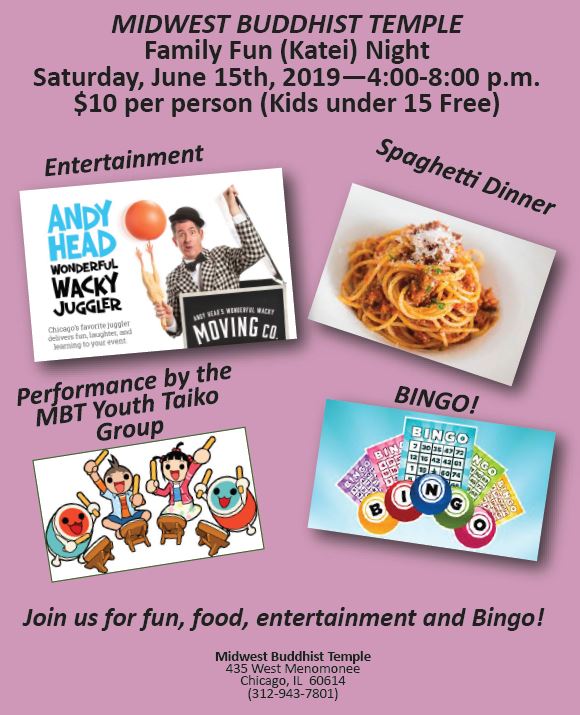 Family Fun Night (or Katei Night) continues an MBT tradition of gathering the Sangha for an evening of food, fun, and entertainment. Join us on June 15 at MBT starting at 4:00 pm. The suggested donation is $10 for adults and kids under 15 are free! Everyone is welcome to attend – for more information please contact our office (312.943.7801 or office@mbtchicago.org).