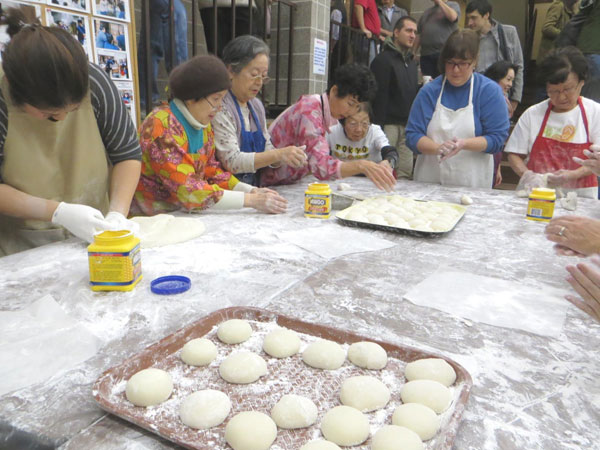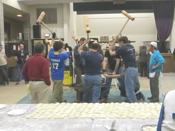 To make mochi, teams of hearty volunteers take turns pounding rice with wooden mallets in an ever accelerating pace until the rice becomes smooth. Other volunteers form the finished mochi into small disks that are either left plain or filled with sweetened azuki beans. Either way, fresh mochi is a delicious treat. To learn more about this tradition visit our Mochitsuki page.