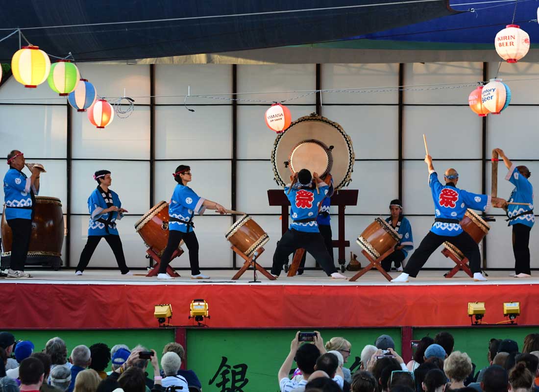 The members come from many different backgrounds and, being a temple group, make performance and participation in the Obon Odori and Ginza Holiday Festival their priorities. The drumming equipment is made by the group from wine barrels and skinned with un-tanned cowhides. The music they play is from many different sources and groups—all committed to spreading this form of artistry.